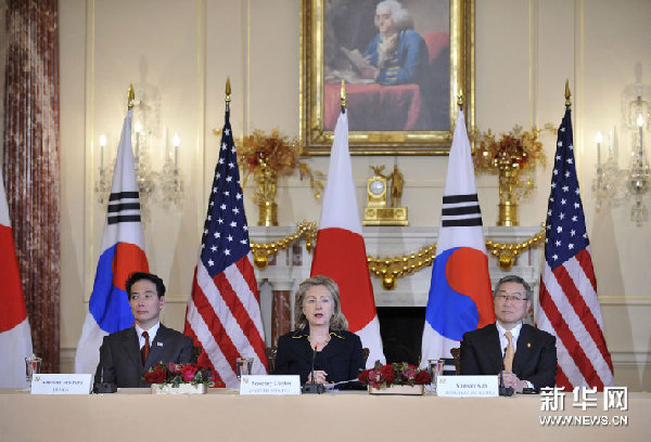12月6日,在美国首都华盛顿国务院,美国国务卿希拉里·克林顿(中)、韩国外交通商部长官金星焕(右)和日本外务大臣前原诚司举行会晤。美日韩三国外长当日在华盛顿会晤,讨论朝鲜半岛最新局势及其对地区安全的影响。新华社记者张军摄