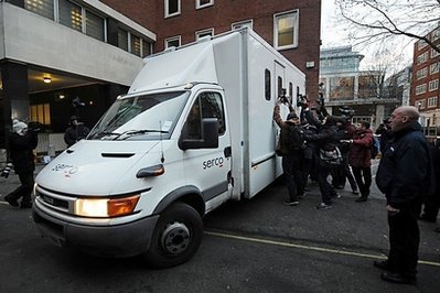 据信载有阿桑奇的囚车遭到记者的“围追堵截”。