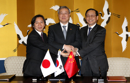16日,中、韩、日三国政府代表在首尔签署了《中日韩三国政府关于建立三国合作秘书处的协议》。根据协议,三国将于2011年成立三国合作秘书处。这被韩国媒体称为东北亚三个相邻国家“具有里程碑意义的事件”。
