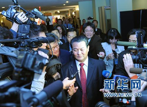 12月19日,在纽约联合国总部安理会磋商室外,记者包围采访朝鲜常驻联合国代表申善昊(中)。当日,联合国安理会就朝鲜半岛局势举行紧急闭门磋商。新华社记者申宏摄