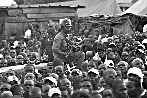 12月18日,阿比让,科特迪瓦政府军在争议总统洛朗·巴博支持者集会上守卫。当日,巴博通过国家电视台发布公告要求联合国驻科行动团和法国军队撤出国境。联合国方面当天召开紧急会议,商议如何作出回应。当天早些时候,联合国驻科特迪瓦维和部队一处营地遭6名蒙面男子武装袭击,尚无人员伤亡报告。