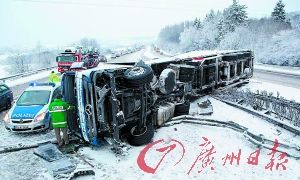 强降雪18日继续袭击欧洲多国,致使多处机场关闭,航班延误,空中和地面交通不畅,民众圣诞节前出行受阻。 为弥补极端天气所引发的不利影响,不少商家打折促销或延时营业,为节前销量奋力“一搏”。(下图为近日在德国,一辆卡车因路滑发生交通事故。)
