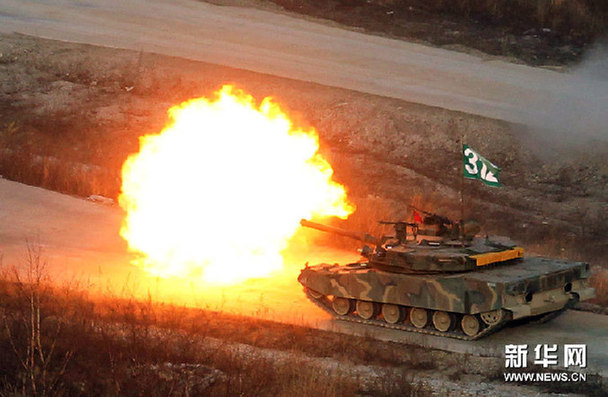 12月23日,在韩国抱川,K-1坦克在演习中。当日,韩国陆军和空军在京畿道抱川市军用射击场举行了“最大规模的联合火力演习”。新华社/联合通讯社