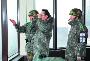 23日,韩国总统李明博视察距离朝鲜只有750米的韩军部队驻地。