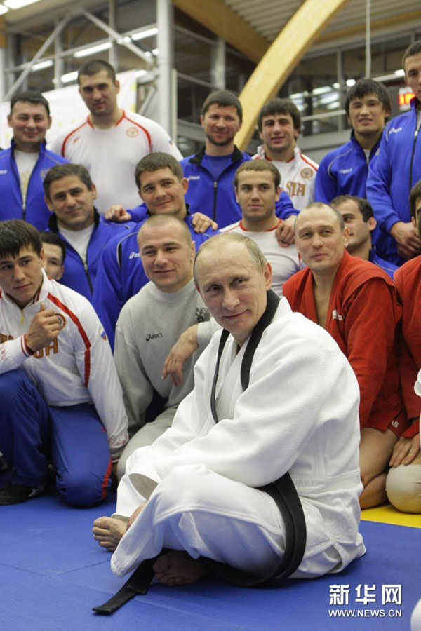 12月22日,俄罗斯总理普京(前)在俄罗斯圣彼得堡市的一家体育俱乐部和柔道运动员们坐在一起。新华社/法新