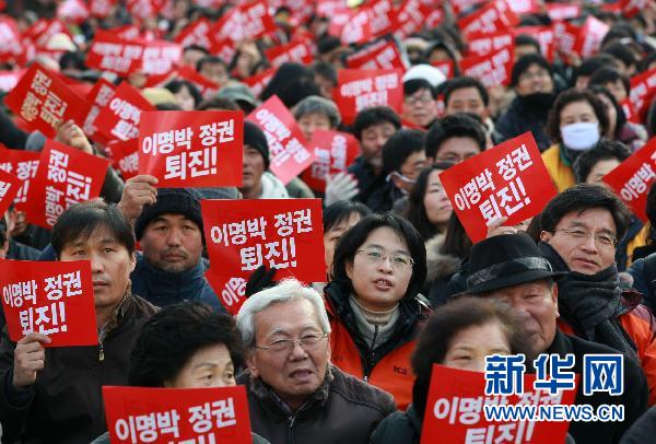 12月18日,在韩国首尔火车站,人们手举标语,高喊口号,要求李明博政府下台。 新华社发(朴真熙摄)
