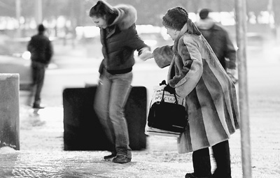 图为莫斯科街头的行人在结冰的路面上相互搀扶着行走。人民图片