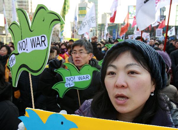 12月18日,在韩国首尔火车站,人们手举标语,高喊口号,要求李明博政府下台。当日,数千名韩国民众在首尔举行抗议,要求李明博政府下台。韩国政府16日宣布将在18日至21日之间的某一天在延坪岛海域举行海上实弹射击训练。新华社发(朴真熙摄)
