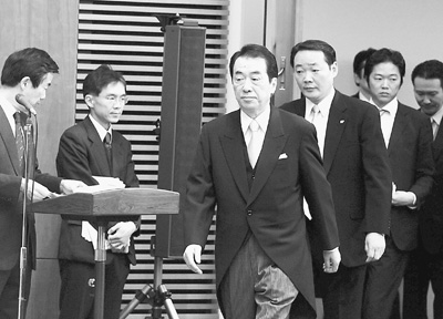 1月4日,在日本东京首相官邸,日本首相菅直人(左三)步入会场准备参加记者招待会。 新华社记者 季春鹏 摄