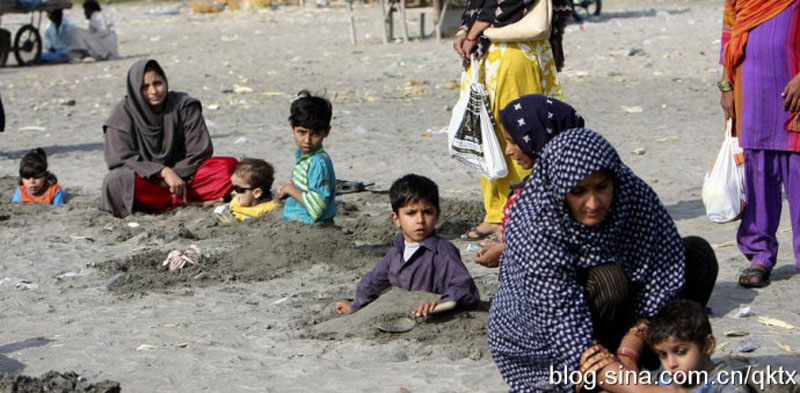 一名巴基斯坦儿童被家长埋在土中戴上眼镜观看日食。