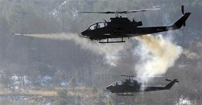 1月6日,韩国一架AH-1S眼镜蛇直升机在延坪岛进行实弹射击演练。