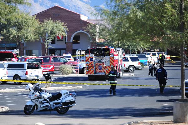 1月8日,警察聚集在美国亚利桑那州图森市的枪击案现场。新华社/美联