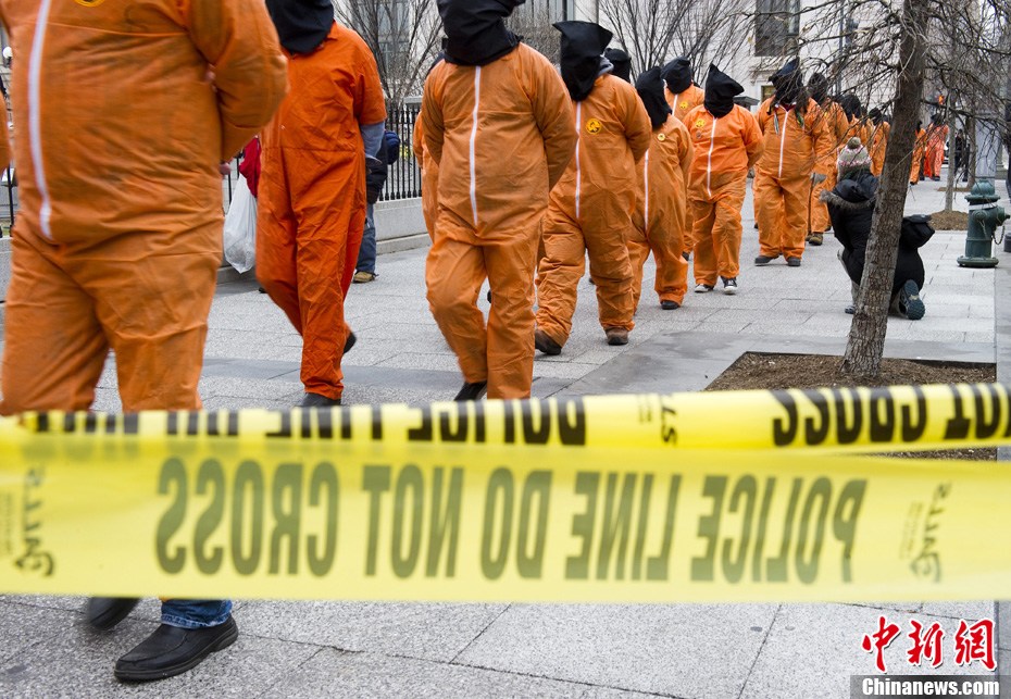 1月11日,美国华盛顿,示威者穿着橙色的囚服游行,要求关闭关塔那摩监狱。当天是关塔那摩监狱建立9周年纪念日。