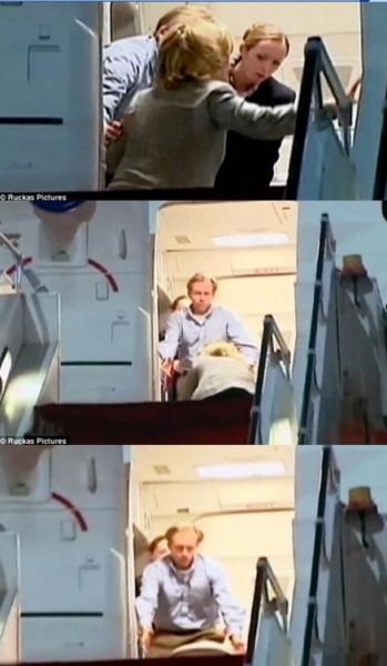 希拉里在机舱门口脚下一滑,摔了一跤,助手见状赶紧搀扶