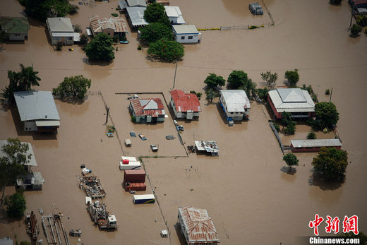位于澳大利亚东北部的昆士兰州近日连降暴雨,暴雨引发50年来最大的洪涝灾害,造成重大财产损失。当地20万人受到洪水的影响,4000多人被迫转移搬迁。目前昆州一些地区的降雨仍在继续。图为1月6日,昆州首府布里斯班的暴雨造成多街区被淹,水位猛涨。