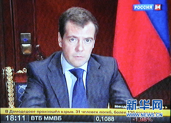 1月24日,俄罗斯总统梅德韦杰夫通过电视表示,已下令有关部门组建调查小组,侦破当天发生的莫斯科多莫杰多沃机场爆炸案。当地时间24日16时32分,莫斯科多莫杰多沃机场发生爆炸,截至目前已造成31人死亡,130多人受伤。俄强力机关已将其作为恐怖袭击立案侦查。新华社记者 赵嘉麟摄