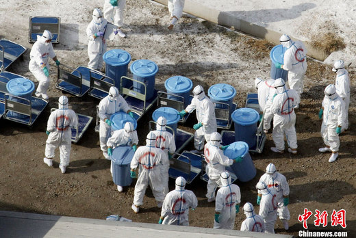 1月24日,在日本宫崎县的一家出现高致病性禽流感疫情的养鸡场,身着防护服的工人正在转移被屠宰的鸡。宫崎县政府23日宣布,已确认该县新富町一家养鸡场出现高致病性禽流感疫情,这是短短数天内宫崎县第二次报告禽流感疫情。