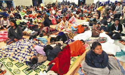 图片说明:泰国一个临时收容所内住满逃难的边境村民。