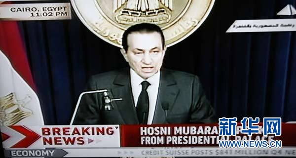 这张2月10日拍摄的电视截图显示,埃及总统穆巴拉克发表电视讲话。埃及总统穆巴拉克当晚发表电视讲话宣布将部分权力移交给副总统苏莱曼。 新华社发