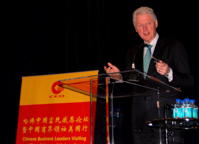 克林顿当日下午在曼哈顿接见中国商界领袖团一行,并发表演讲,随后与有中国“商界华陀”之称的企业家严介和对话,共同为美中经济发展与合作“把脉”。