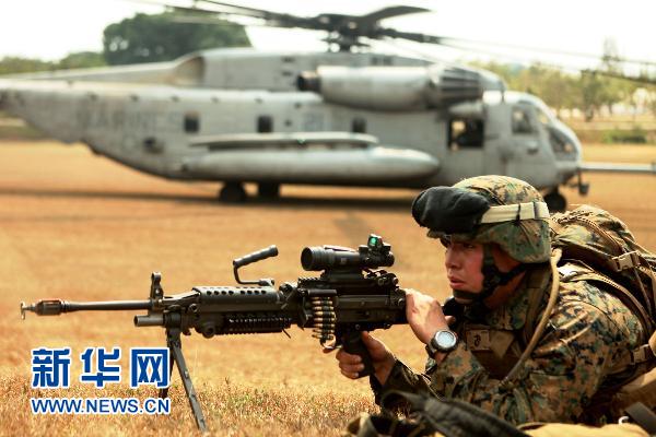 2月13日,一名步兵在一次直升机袭击演练中为直升机做火力掩护。 当日,“金色眼镜蛇”年度联合军演在泰国继续举行, 来自泰国、美国、印度尼西亚、新加坡、日本、韩国、马来西亚等国的约1.1万名军事人员参加。本年度的联合军演从2月7日开始,将持续到2月18日结束,演习主要场所包括泰国中部和北部主要海陆空军事基地及演练场。新华社发
