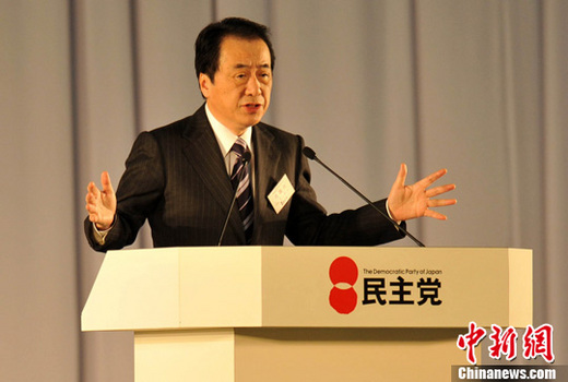 1月13日下午,日本首相菅直人率领民主党全体议员召开定期党大会,会上通过了2011年度工作方针。图为身为民主党党代表的菅直人发表演讲。中新社发 孙冉 摄