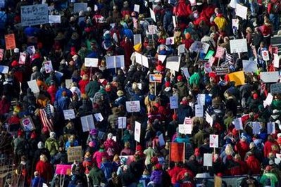 大批抗议者在威斯康星州首府麦迪逊州议会大厦的示威持续超过一个礼拜时,“战场”开始向俄亥俄州转移。共和党人打算在俄亥俄州议会通过一项议案,结束州政府雇员的集体谈判权,大幅减少警察、消防员等地方政府雇员人数。