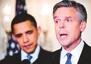 美驻华大使洪博培(右),被视为将在2012年总统竞选中挑战奥巴马的共和党人。