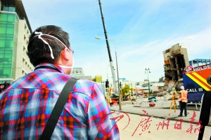 本报记者在封锁线外看CTV大楼遗址。 本报特约记者 王世瑞 摄