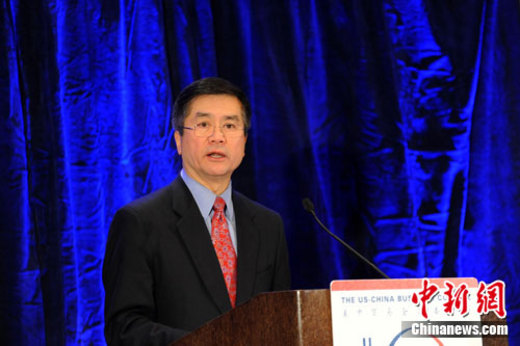 资料图:美国商务部长骆家辉13日在美中贸易全国委员会举办的午餐会上发表演讲时表示,美国欢迎中国经济快速发展,这不仅对中国自身有利,对美国和全球经济也有利。中新社发 吴庆才 摄