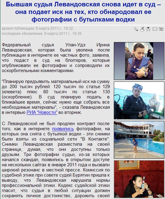 据俄罗斯纽带新闻网和“NEWSRU”网站3月8日报道,俄罗斯乌兰乌德市联邦法官伊琳娜·列万多夫斯卡娅因在其博客上发布个人不雅照片遭到解职。8日,伊琳娜宣布,她将向传播其个人照片并发表侮辱性言语的博客网站提起诉讼:“我要求他们赔偿20万卢布(约合4.7万元人民币)。其中12万(约2.8万元人民币)卢布针对诽谤行为,8万卢布(约1.9万元人民币)针对侮辱行为。我将在近期提交法院,现在需要搜集必要的材料。”