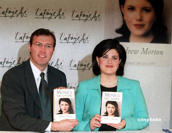 资料图:2003年4月15日,英国知名传记作家安德鲁·莫顿在法国巴黎举行宣传会,与莫尼卡·莱温斯基一起为他的新作——莱温斯基传记作宣传。几年前,莱温斯基因与美国前总统克林顿有染,而成为轰动美国的新闻人物。 中新社发