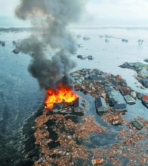 昨日,日本仙台,经历了地震和海啸袭击后,被淹没的房屋起火。