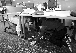 11日,日本东京,美联社东京局的记者们在地震时躲到桌下。