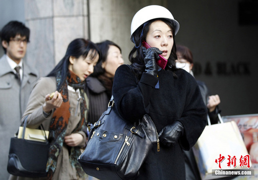 日本近海3月11日发生了强烈地震,首都东京震感强烈。日本气象厅随即发布了海啸警报,称地震将引发约6米高海啸。图为东京市金融区一女子从建筑物内疏散后头戴安全帽在打电话。