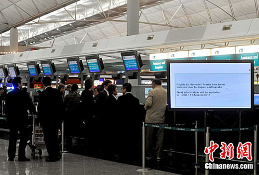 3月11日,日本东北部发生历来最强烈的八点九级大地震。在香港机场国泰航空柜位,不少前往日本的旅客在着急查问相关情况,而LCD电屏不断以英文显示日本成田、羽田两大机场情况。中新社发 邓庆乐 摄