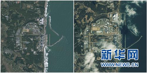 这张拼版卫星图像显示的是2009年11月15日(左)和2011年3月11日拍摄的福岛第一核电站。