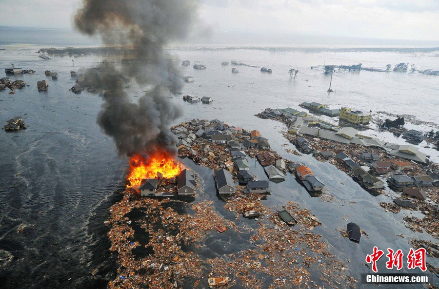 3月11日,宫城县名取市,大量房屋被日本近海强震引起的海啸洪水淹没。日本东北部海岸当地时间3月11日下午遭强震袭击。震区目击者表示,这可能是20多年来,日本遇到的震级最高的地震。