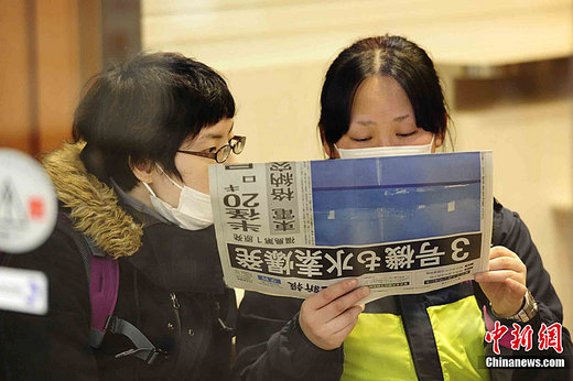 3月14日下午,两名日本仙台市的女性在看关于福岛核电站的报道。报纸头版写道《第三号机组也发生氢气爆炸》。据报道,位于福岛县境内的福岛第三核电站发生了氢气爆炸。中新社发 侯宇 摄