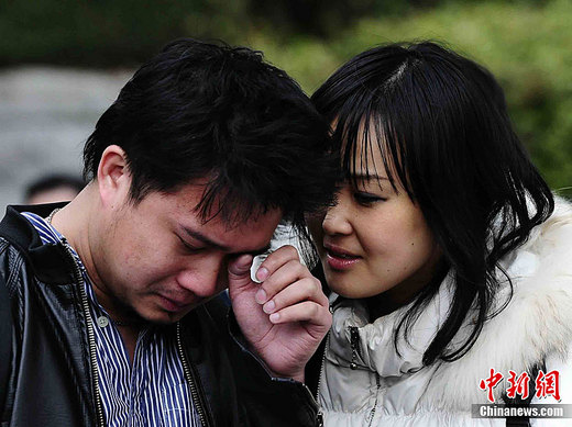 3月14日下午,一名日本女性在安慰身边哭泣的男性。当天部分仙台民众在市政府前的车站乘坐大巴,准备前往邻接的山形县暂时避难。中新社发 侯宇 摄