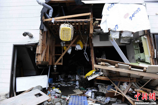 3月15日下午,日本岩手县大船渡市受大海啸袭击后的一幢房屋。大船渡市紧邻海港,是此次日本东北大地震中受灾最严重的地区之一。中新社发 侯宇 摄