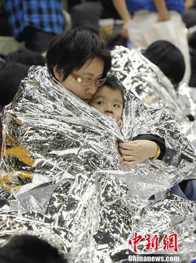 2011年3月11日,东京,在临时避难所里,一位母亲抱着自己的儿子。