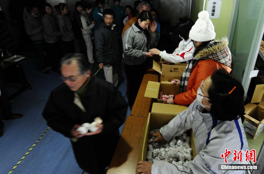 3月16日,在日本岩手县大船渡地区公民会馆避难的民众排队领取食物。中新社发 侯宇 摄