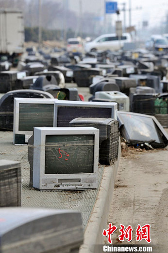2011年3月13日,青森县,在遭受地震袭击后,被毁坏的电视机散落在街道上。