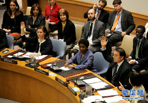 3月17日,在美国纽约联合国总部,中国常驻联合国代表李保东(前右二)、巴西常驻联合国代表维奥蒂(前左一)举手投弃权票。当日,联合国安理会通过决议,决定在利比亚设立禁飞区。 新华社记者申宏摄