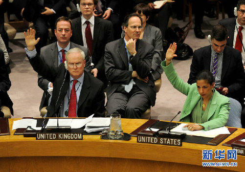 3月17日,在美国纽约联合国总部,美国常驻联合国代表苏珊·赖斯(前右)、英国常驻联合国代表格兰特(前左)举手投赞成票。当日,联合国安理会通过决议,决定在利比亚设立禁飞区。 新华社记者申宏摄