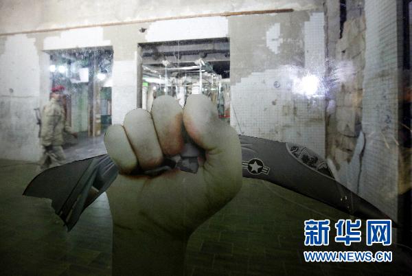 3月19日,在利比亚首都的黎波里,一名士兵走过一只手捏碎一架F-16飞机的宣传图片。据利比亚电视台20日报道,截至目前已有约48人在空袭中死亡,另有150人受伤。 新华社/路透