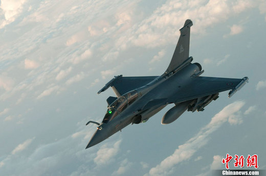 当地时间3月19日,一架法国阵风战机攻击利比亚期间接近一架空中加油机进行加油作业。