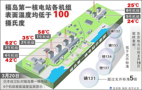 经过多天的注水降温作业,核电站6个机组的表面温度目前全部低于100摄氏度。日本防卫大臣北泽俊美表示,日本自卫队利用直升机搭载一种红外装置对福岛第一核电站各机组表面温度进行测量的结果显示,1号至6号机组表面温度分别为58摄氏度、35摄氏度、62摄氏度、42摄氏度、24摄氏度和25摄氏度。