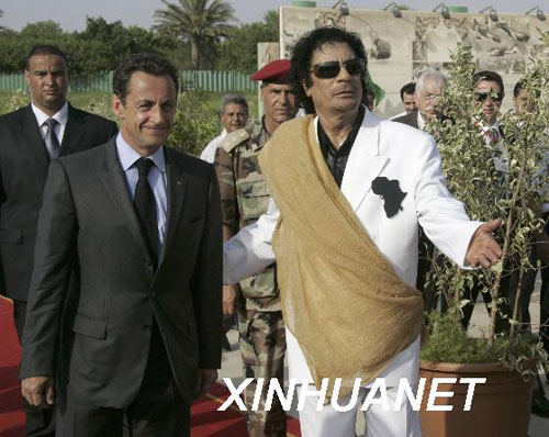 2007年7月萨科奇访问利比亚,受到卡扎菲亲切接近。当时,萨科奇在外访中,积极向利比亚等国推销“阵风”战斗机等军火。(新华网图片)